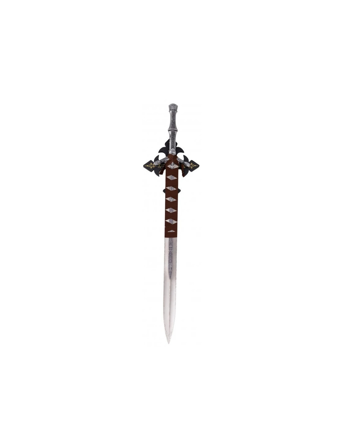 En el videojuego, esta forma es el punto de partida antes de transformarla en su hoja mística. Con un tamaño de 101 cm y 76,5 cm de hoja, está fabricada en acero con acabado mate y decorada con runas grabadas que aportan un toque místico y reconocible para cualquier jugador.